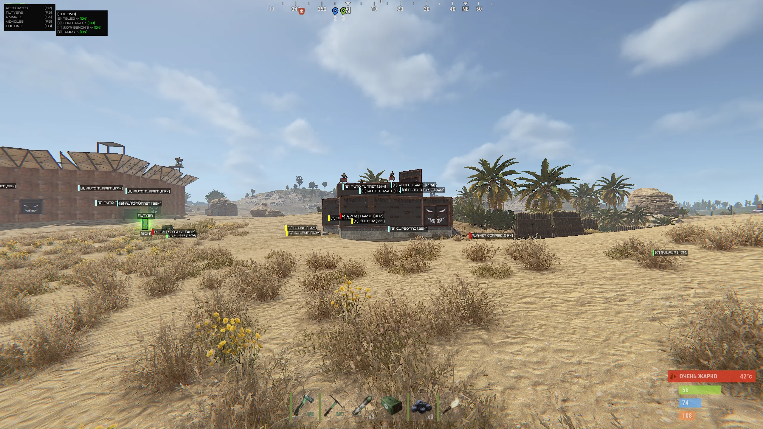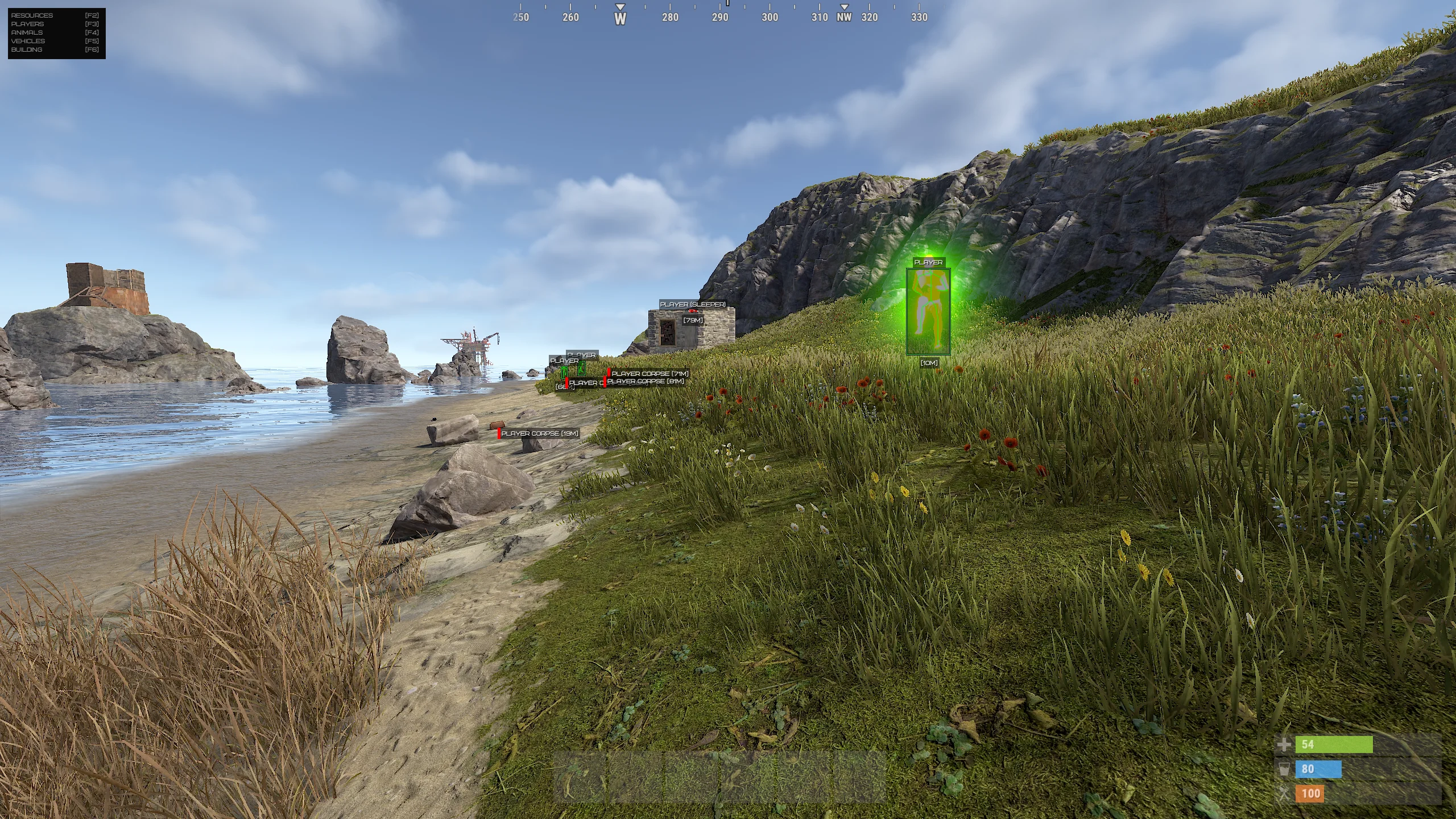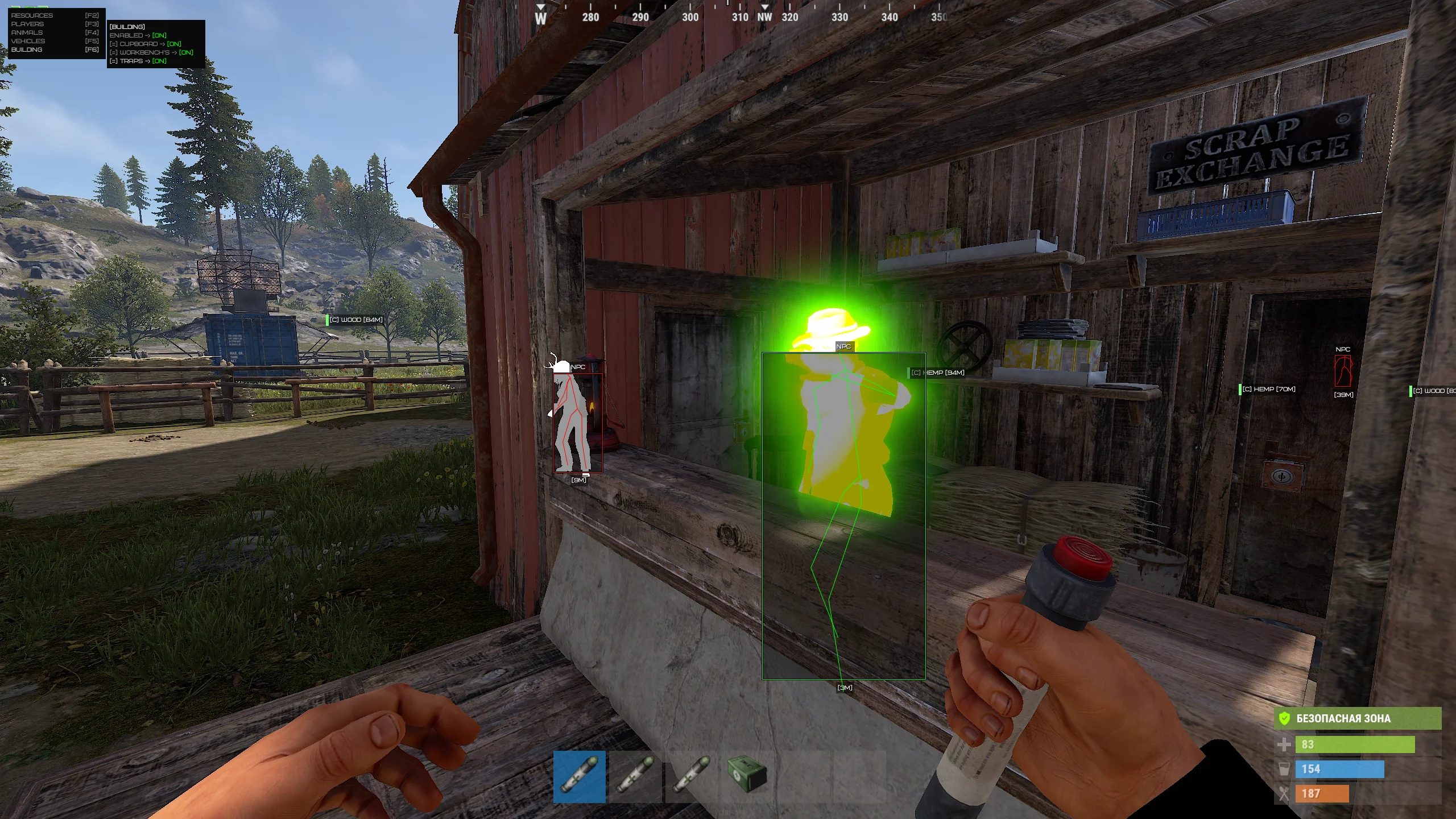فينكس رست ESP يوفر رؤية واسعة لما يحدث في عالم رست. يتم عرض اللاعبين، والشخصيات غير القابلة للعب (NPC)، والحيوانات، والمركبات، وصناديق الغنائم، والموارد القابلة للحصاد، والأشياء البيئية الرئيسية. هذا يسمح بتخطيط الطرق مقدمًا، وتجنب المواجهات غير المرغوبة، وتحسين الزراعة.